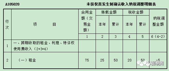 ?、芗{稅調整:會計上2021年確認租賃收入25萬元,稅務上確認租賃收入為20萬元,因此甲公司應調減應納稅所得額5萬元(25-20)。