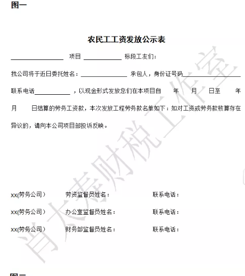 第四步:勞務公司制定統一格式的“農民工工資發放公示表”范本,公示表中必須明確如下內容:民工姓名、工作天數、工資總額、投訴電話、接受投訴的部門負責人(勞務公司的辦公室和財務部負責人),投訴的時間區間(一般規定7個工作日),民工工資發放代理人。勞務公司在發放農民工資或勞務款之前,包工頭或班組長必須要在工程項目比較醒目的公告欄處張貼“農民工工資發放公示表”,具體的范本如下圖1、圖2所示: