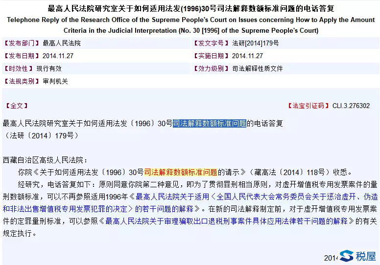法研[2014]179號看似已經解決了虛開增值稅專用發票罪的量刑適用依據問題,但自2014年11月至今,在司法審判實務中,絕大多數的法院仍堅持適用法發[1996]30號對虛開增值稅專用發票罪進行定罪量刑,并非按照法研[2014]179號的指示適用法釋[2002]30號司法解釋。但是,司法實踐中也有參照法研[2014]179號適用的案例,但為數不多。例如杜松犯虛開增值稅專用發票罪案((2016)遼02刑終69號)。(案例可按照裁判文書文號上裁判文書網查詢)