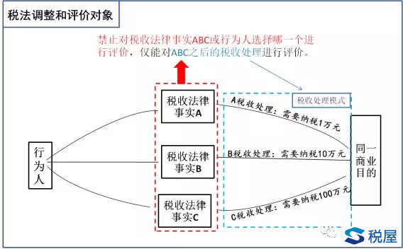 以圖中為例,行為人如果覺得稅收法律事實A的稅款更低,而選擇了稅收法律事實A,則屬于稅收籌劃,對行為人的稅收行為是否違法的評價只能建立在稅收事實A的基礎上,禁止以并未出現的稅收事實B、稅收事實C作為評價。