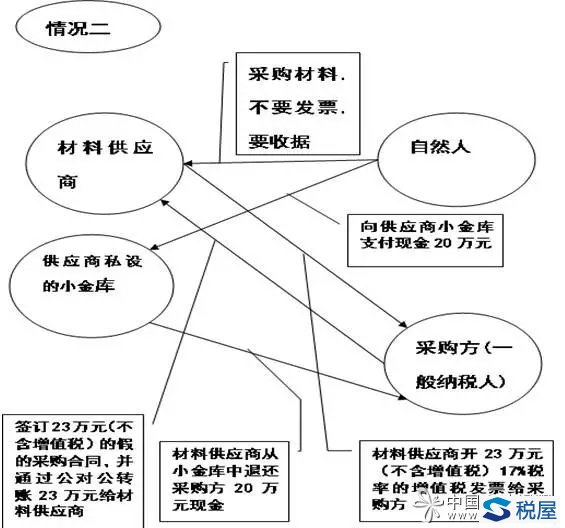 圖中顯示:采購方(一般納稅人)與材料供應商簽訂了一份假的采購合同23萬元(不含增值稅),并向材料供應商轉賬23萬元,材料供應商向采購方(一般納稅人)開具23萬元(不含增值稅)17%稅率的增值稅專用發票,雖然有合同流、資金流、票流,但沒有物流,實質上是采購方(一般納稅人)花了3萬元從材料供應商手里買了一張真的增值稅專用發票。這張23萬元的增值稅專用發票是虛開發票,不能在采購方抵扣增值稅進項稅額。