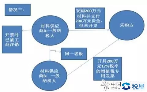 圖中顯示:收款方、銷售方是一般納稅人的材料供應商A,發票開具方是與公司A同一老板的材料供應商B,出現了銷售方、收款方和開具方不是同一個單位的情況,采購方獲得的一張200萬元的增值稅專用發票不可以抵扣增值稅進項稅金,而且該開票行為是一種虛開增值稅專用發票的行為。 |