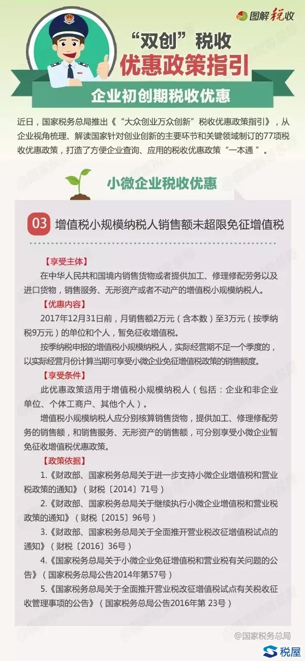 近日,國家稅務總局推出《“大眾創業萬眾創新”稅收優惠政策指引》,從企業視角梳理、解讀國家針對創業創新的主要環節和關鍵領域制訂的77項稅收優惠政策,打造了方便企業查詢、應用的稅收優惠政策“一本通 ”。從今天開始,我們將陸續編發77項稅收優惠政策的具體內容。今天發布企業初創期稅收優惠之小微企業稅收優惠政策:增值稅小規模納稅人銷售額未超限免征增值稅。