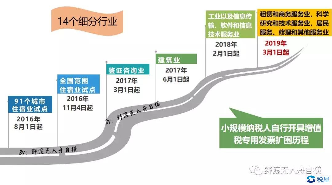 一路走來,從2016年8月1日在91個城市試點住宿業開始,到2019年3月1日這個節點(國家稅務總局公告2019年第8號),以前需要增值稅專用發票只能到稅務機關代開的小規模納稅人如今翻身農奴把歌唱,終于在14個細分行業中也擁有了開票權。