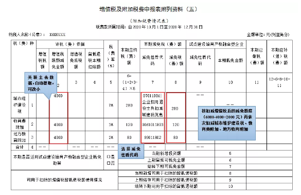 2.填寫《增值稅及附加稅費申報表附列資料(五)》(附加稅費情況表),確認城市維護建設稅、教育費附加、地方教育附加的計稅(費)依據,選擇減稅性質代碼、填寫減免稅(費)額,扣減城市維護建設稅、教育費附加、地方教育附加。