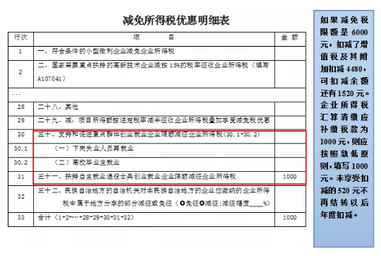 企業招用重點群體和退役士兵減免企業所得稅,填寫《A107040減免所得稅優惠明細表》第30行和第31行,在對應的“金額”欄內填寫減免稅額。