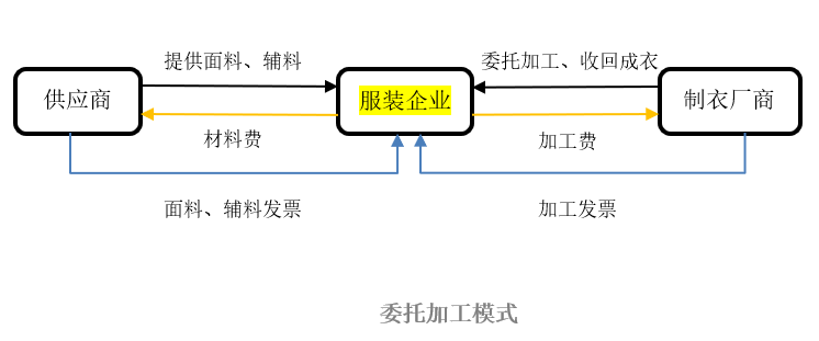 服務企業可以調整為委托加工模式,直接向供應商采購面料、輔料,作為委托加工物資發給制衣廠,委托制衣廠加工成衣,服裝企業收回成衣,向制衣廠支付加工費。