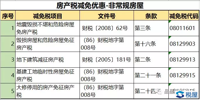 第二類,與非常規房屋相關的優惠,一共有4項。什么是非常規房屋呢?這里我把受災的,毀損的、危險的、大修理停用的、基建臨時房屋,以及地下建筑統一歸類為非常規房屋,除了地下建筑根據用途是減征房產,其余的都是免征。
