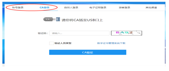 登錄主界面,常用“賬號登錄及CA登錄”兩種方式登錄