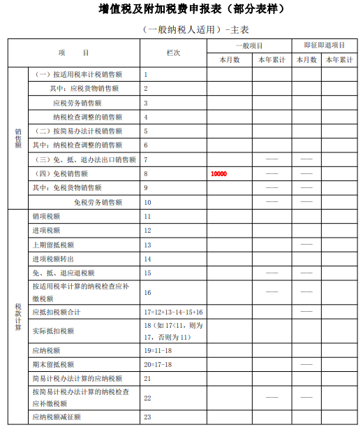 某提供養老服務的企業(一般納稅人),屬期6月提供養老服務取得收入10000元,并為客戶開具增值稅普通發票(均為自行開具的發票),該納稅人選擇享受免征增值稅政策。增值稅申報表填列方式如下: