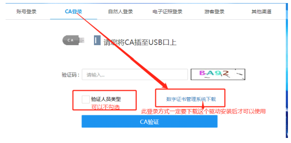 驅動程序可以按照以下操作步驟下載,所有驅動及設備準備就緒,可以直接輸入“驗證碼”點“CA驗證”進行登錄。