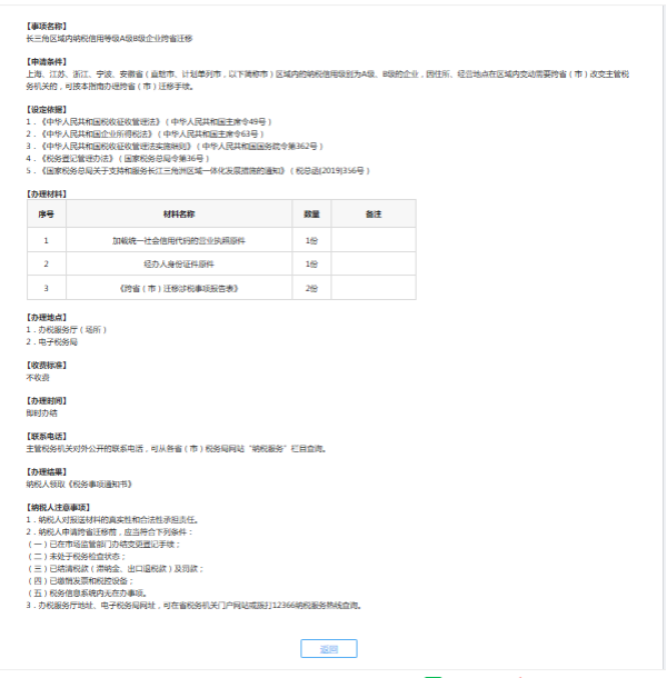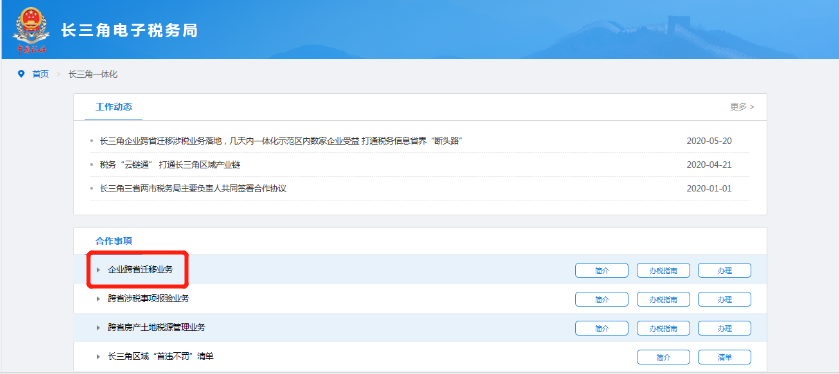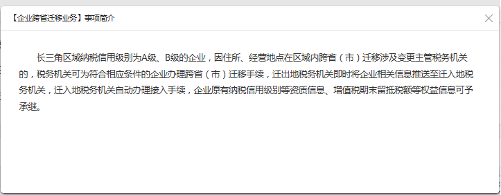 專欄界面可以查看企業跨省遷移業務“簡介”與“辦稅指南”。