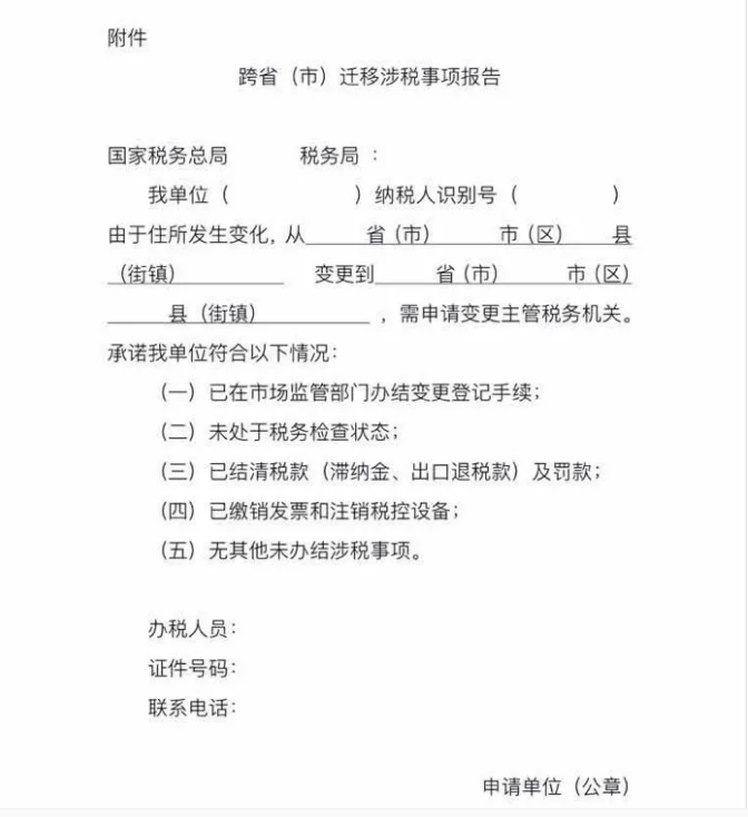 申請條件:在適用范圍內的企業因住所、經營地點在區域內變動需要跨省(市)改變主管稅務機關的,如同時符合下列條件,稅務機關可為其辦理跨省(市)遷移手續: