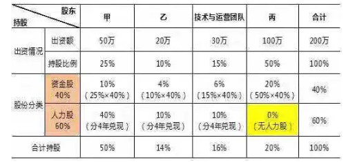 第一步:經大家一起協商一致:將公司的股權分為兩部分:資金股和人力股,其中資金股占比40%,人力股占比60%,在人力股中,甲管理人力股占40%、乙的技術人力股占10%,技術與運營團隊的人力股占10%,人力股分4年解鎖。