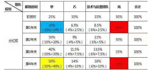第四年末分紅的股權比例:100%-(甲第一年末分紅的股權比例+乙第一年末分紅的股權比例+技術與運營團隊第一年末分紅的股權比例)=(100%-50%-14%-16%)=20%;