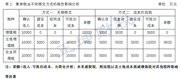 總體而言,方式一的節稅金額大于方式二。在企業所得稅方面,收入與成本形成的差額都為-5000萬元,可用于抵減其他銷售物業的稅前利潤,兩種移交方式對企業所得稅影響一致。