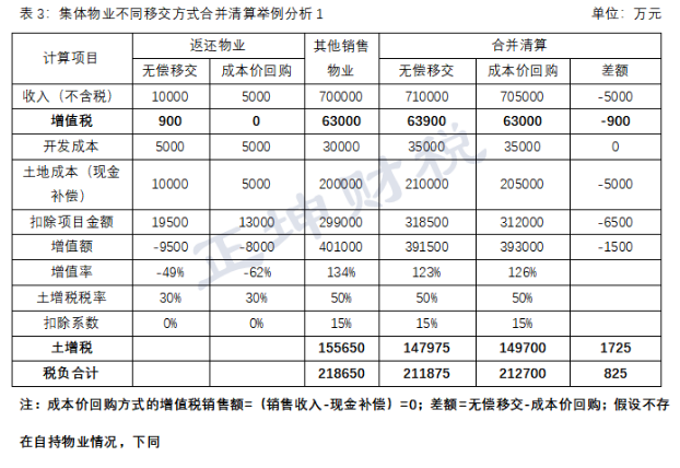 如果其他銷售物業形成的增值額為401,000萬元,增值率為134%。兩種移交方式在合并清算下形成的土地增值率分別為123%和126%,適用稅率都為50%,此時無償移交方式相比成本價回購方式的土地增值稅節稅金額多出1,725萬元,超過增值稅的增加金額900萬元,即無償移交方式相比成本價回購方式總體稅負降低825萬元,此時無償移交方式優于成本價回購方式。通過還原土地增值稅的計算過程,可以發現該節稅金額=1500×50%(稅率)+6500×15%(速算扣除系數)=1725萬元,即土增稅節稅金額與合并清算后適用的土地增值稅稅率與速算扣除系數直接相關。