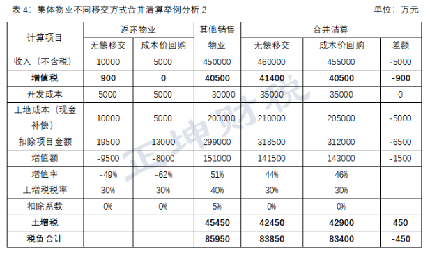 在土地增值稅方面,在考慮加計扣除及開發費用計算扣除影響因素下,兩種移交方式的最高可扣除項目金額分別為19,500萬元和13,000萬元,收入與可抵扣成本形成的差額分別為-9,500萬元和-8,000萬元,如果所移交集體物業與其他銷售物業合并清算,則該差額可用于抵減其他銷售物業形成的增值額,從而降低土地增值稅,具體稅負降低金額需結合其他銷售物業的增值率情況而定。