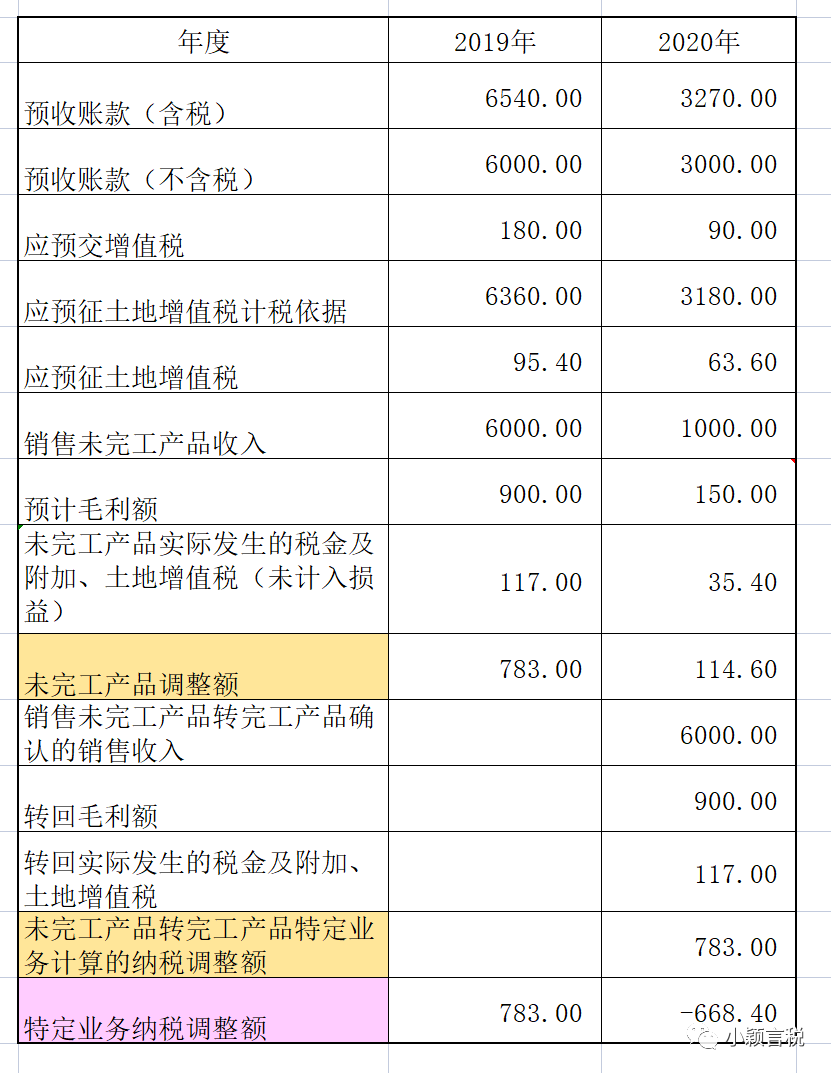 2019年4月1日,一期住宅開始預售,12月31日,預收帳款—一期貸方余額為6540萬元,期初余額為0,全年預交增值稅180萬元(=6540/1.09×3%),城建稅及附加21.6萬元(=180×12%),預繳土地增值稅95.4萬元(=6540-180)×1.5%),未完工產品實際發生的稅金及附加、土地增值稅(未計入損益)117萬元(=95.4+21.6)。