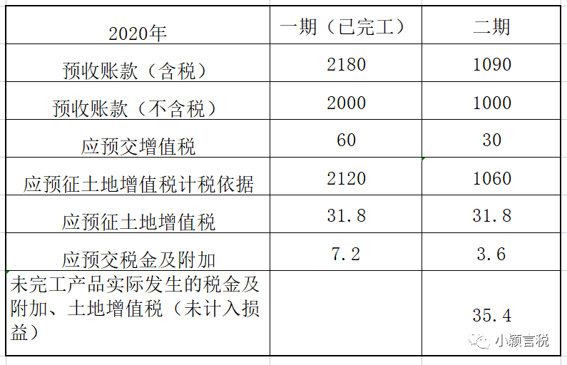 2020年6月30日,一期住宅完工并交付;2020年12月1日,二期商鋪開始預售。2020年12月31日,預收帳款-一期,貸方累計發生額為2180萬元(為交付前收取),期末余額為0;預收帳款-二期,貸方余額為1090萬元,期初余額為0。2020年預繳增值稅90萬元,其中一期60萬元二期30萬元;預繳土地增值稅58.2萬元=(2000-60)×1.5%+(1000-30)×3%,其中一期29.1萬元,二期29.1萬元;預繳城建稅及附加10.8萬元,其中一期7.2萬元,二期3.6萬元。全年結轉主營業務收入8000萬元,主營業務成本6400萬元,未完工產品實際發生的稅金及附加、土地增值稅(未計入損益)32.7萬元。
