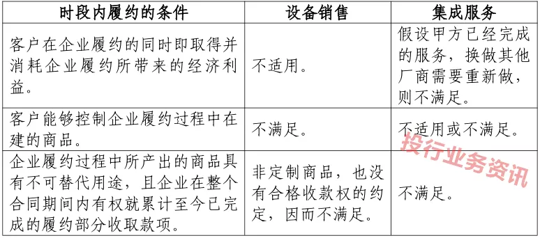 集成服務需要考慮是否滿足一段時間內履行履約義務的條件,集成服務最終需要形成一個系統產品客戶才能受益,因而不滿足企業邊履約客戶邊取得并消耗,該集成服務提供的過程中客戶不能控制企業提供的服務。該集成服務可能滿足不可替代,但是合同中沒有合格收款權的約定,因而不滿足在一段時間內確認收入,屬于時點確認收入。