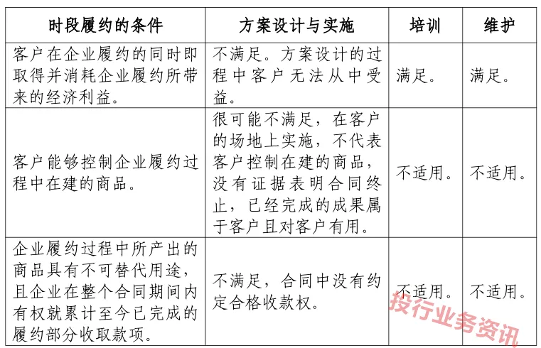 方案設計與實施不滿足時段確認收入的條件,傾向按照時點確認收入。培訓和維護服務一般滿足按時段確認收入條件的第一條。