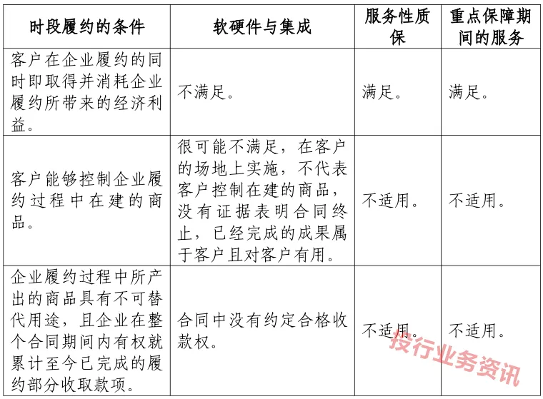 (2)時段還是時點履行的履約義務。分析軟硬件集成、服務性質保、重點保障期間的服務等履約義務是否滿足時段履約的三個條件之一: