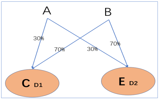 A、B兩個自然人分別持有C公司30%、70%的股權,C公司名下持有D1、D2兩塊地,分別價值3000、5000萬元,現在C公司要存續分立為C和E公司,分立后,A、B分別持有C公司30%、70%的股權,同時C公司持有D1地塊;A、B分別持有E公司30%、70%的股權,E公司持有D2地塊。請問分立后A、B公司是否應該繳納個人所得稅,如果繳納,按什么稅目繳納。分立后的情況如下圖: