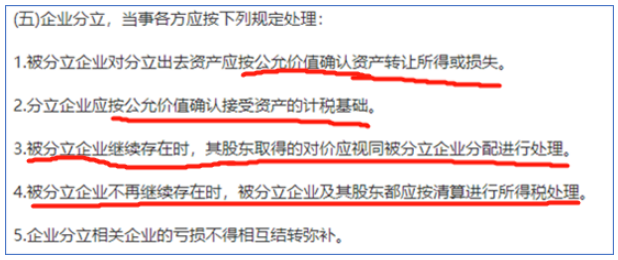 也有觀點認為,企業分立過程的實質是擬分立資產從被分立企業轉讓給分立企業,在該過程中股東取得了擬分立資產對應的價值分配,然后投資到分立企業,取得分立企業的股權。因此,個人股東應該按照“利息股息紅利所得”交納20%個人所得稅。類比企業股東,59號文件明確規定企業分立中股東應該按照“分配”進行稅務處理。稅款征收一定是基于既定的業務實質進行的,不會因股東身份而有所變化。因此,分立業務中個人股東也應該按照“分配“(即利息股息紅利所得)交納個人所得稅。如下是政策原文: