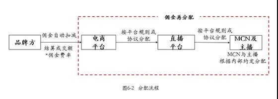 線上傭金按照直播帶貨結算成交額和線上傭金費率計算,線上傭金費率由產品方與MCN公司或個人主播協商確定。在實際利益分配時,產品方在電商平臺設置約定的傭金費率,直播開始至產品鏈接下架期間,電商平臺直接根據結算成交額和設置的傭金費率自動扣減線上傭金,線上傭金后續由電商平臺、直播平臺、MCN公司及主播根據平臺規則或協議約定進行再分配。具體分配流程見下圖:
