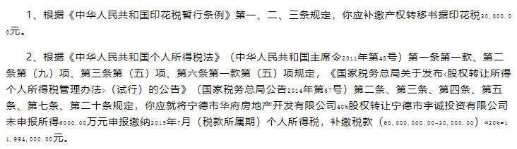 2、根據《中華人民共和國個人所得稅法》(中華人民共和國主席令2011年第48號)第一條第一款、第二條第(九)項、第三條第(五)項、第六條第一款第(五)項規定,《國家稅務總局關于發布<股權轉讓所得個人所得稅管理辦法>(試行)的公告》(國家稅務總局公告2014年第67號)第二條、第三條、第四條、第五條、第七條、第二十條規定,你應就將寧德市H房地產開發有限公司40%股權轉讓寧德市Y投資有限公司未申報所得6000.00萬元申報繳納2015年7月(稅款所屬期)個人所得稅,補繳稅款(60,000,000.00-30,000.00)*20%=11,994,000.00元。